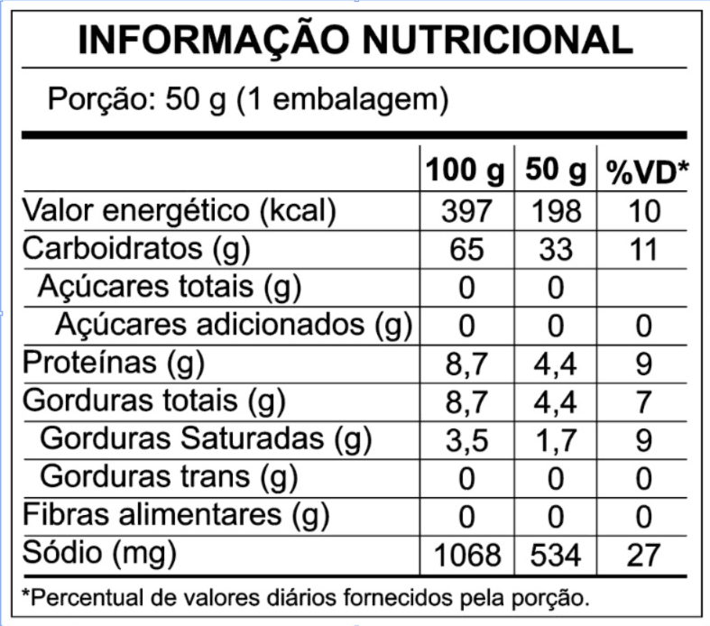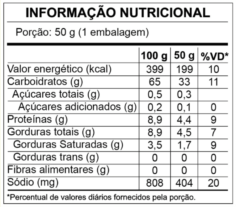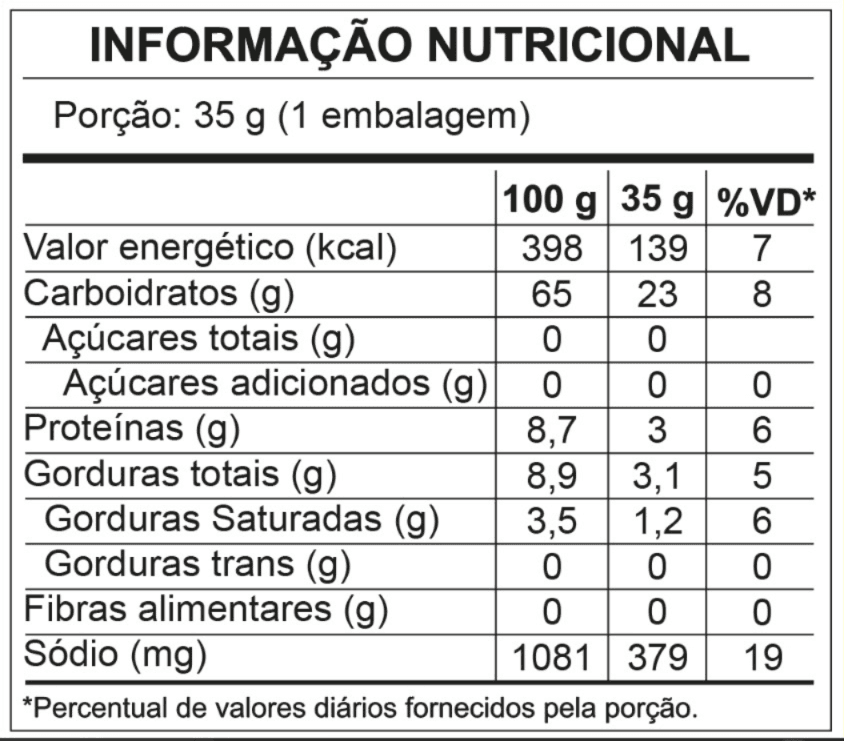 Ingredientes: fubá de milho, óleo de palma, tempero sabor cebola e salsa (substâncias aromatizantes e antiumectantes: INS 300, INS 551), sal refinado, realçador de sabor (INS 621), ácido cítrico, aroma idêntico ao natural de cebola e salsa e corante natural.Contém aromatizante sintético idêntico ao natural.